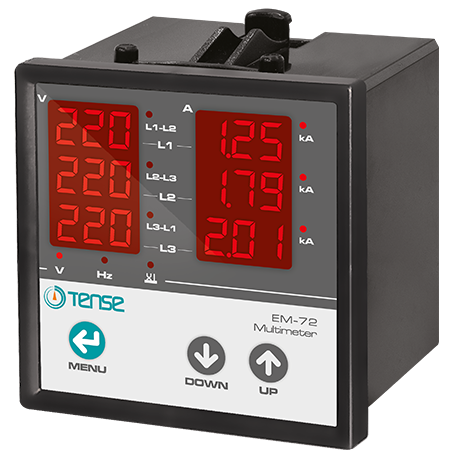 Bağlı olduğu sistemdeki yük veya yüklere ait elektriksel değerlerin takibi için tasarlanan Tense EM-72 Multimetre, kapsamlı bir izleme çözümü sunar. Cihaz; gerilim (V), akım (I), frekans (F) ve görünür güç değerlerini ölçerken, bu parametrelere ait minimum, ortalama, maksimum ve demant değerlerini de hassasiyetle hesaplar.